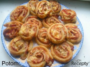 Půlku toho těsta rozválíte do poměrně tenkých rozměrů (nevím přesně kolik to je,dělám to od oka) jakože docela tenký no..potom vezmete kečup a potřete kečupem,nastrouhaný sýr posypete (je dobrý toho tam mít hodně toho sýra,pokud máte rádi:) )...ted' po jedné plátky šunky či salámu.Ted' dokořeníte..já tam dávám kmín a nejhlavnější je sůl že,samozřejmě :D..Ted' srolujete a vznikne vám zamotaný válec a nakrájíte zhruba na 2 cm tlusté kolečka (může být i tlustčí) Tak..dáte na plech pečící papír a rozehřejete troubu pomalu vkládáte šneky na plech a rozmícháte si vajíčka poté potřete šneky vajíčkem ,vložíte do trouby na 200 stupńú a jenom čekáte :D zhruba to trvá cca 15 min. ..Prostě to poznáte ;D. Aby to vypadalo takhle zhruba (viz obrázek) ,ale nesmí to být vevnitř moc měkký..A hotovo!! Kdo to bude zkoušet tak přeji hodně štěstí a dobrou chut'! :D:). Emily